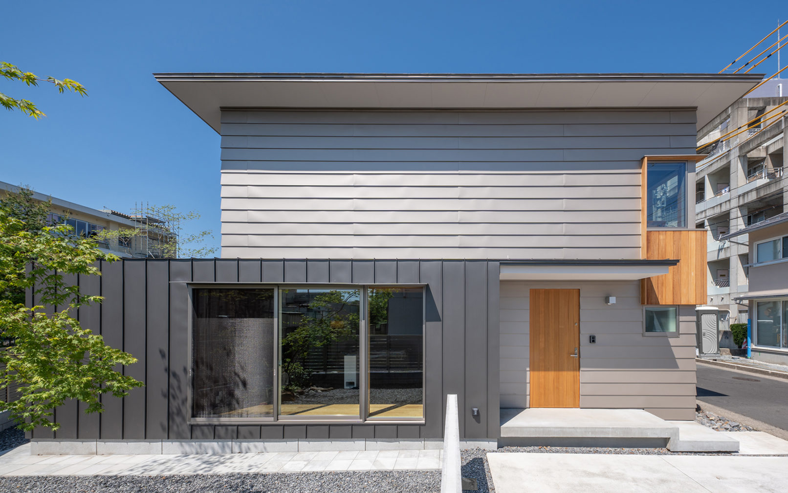 この住宅は施工者であるセンチュリーホームとの間で「小さな家」というテーマを基に、吹抜けで繋がった一体空間、メリハリのある天井高の操作、空間と空間の繋がり方、ディティール、素材感など、小さいながらも広さを感じるような工夫を考えながら設計した。外観に関しても高さを抑え小さくつくることで街に余白をつくりながら美しく佇むプロポーションを意識している。