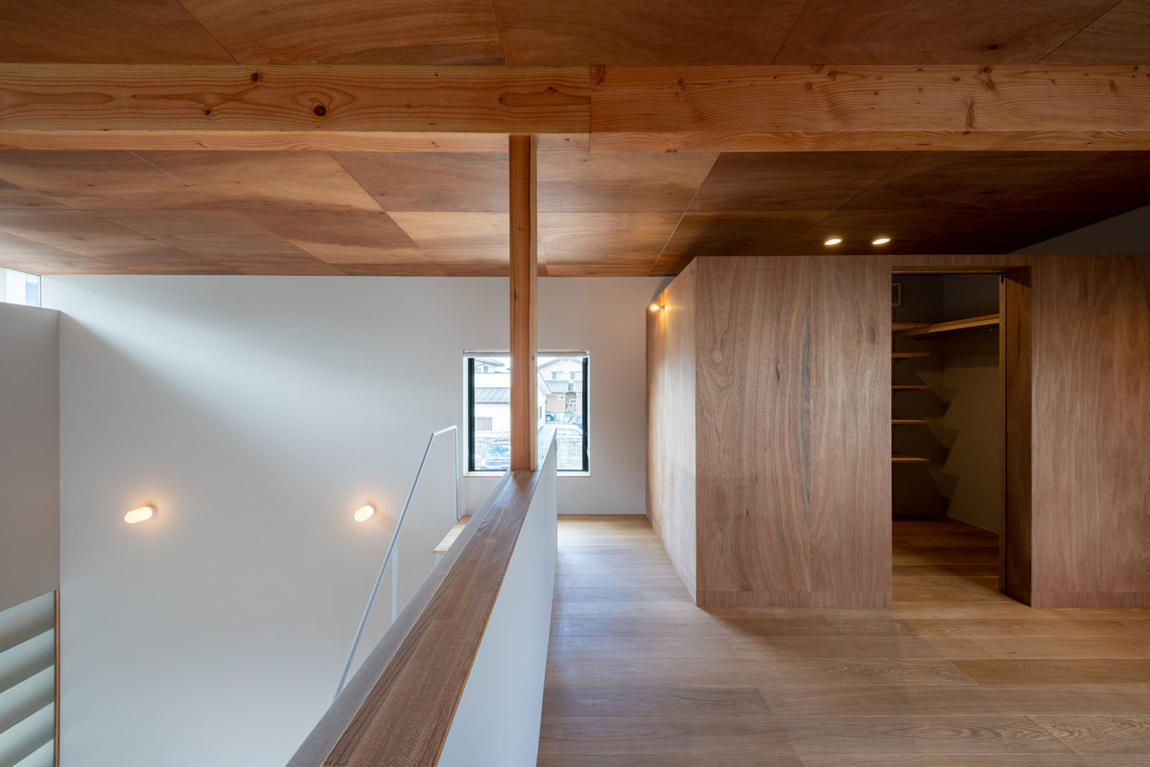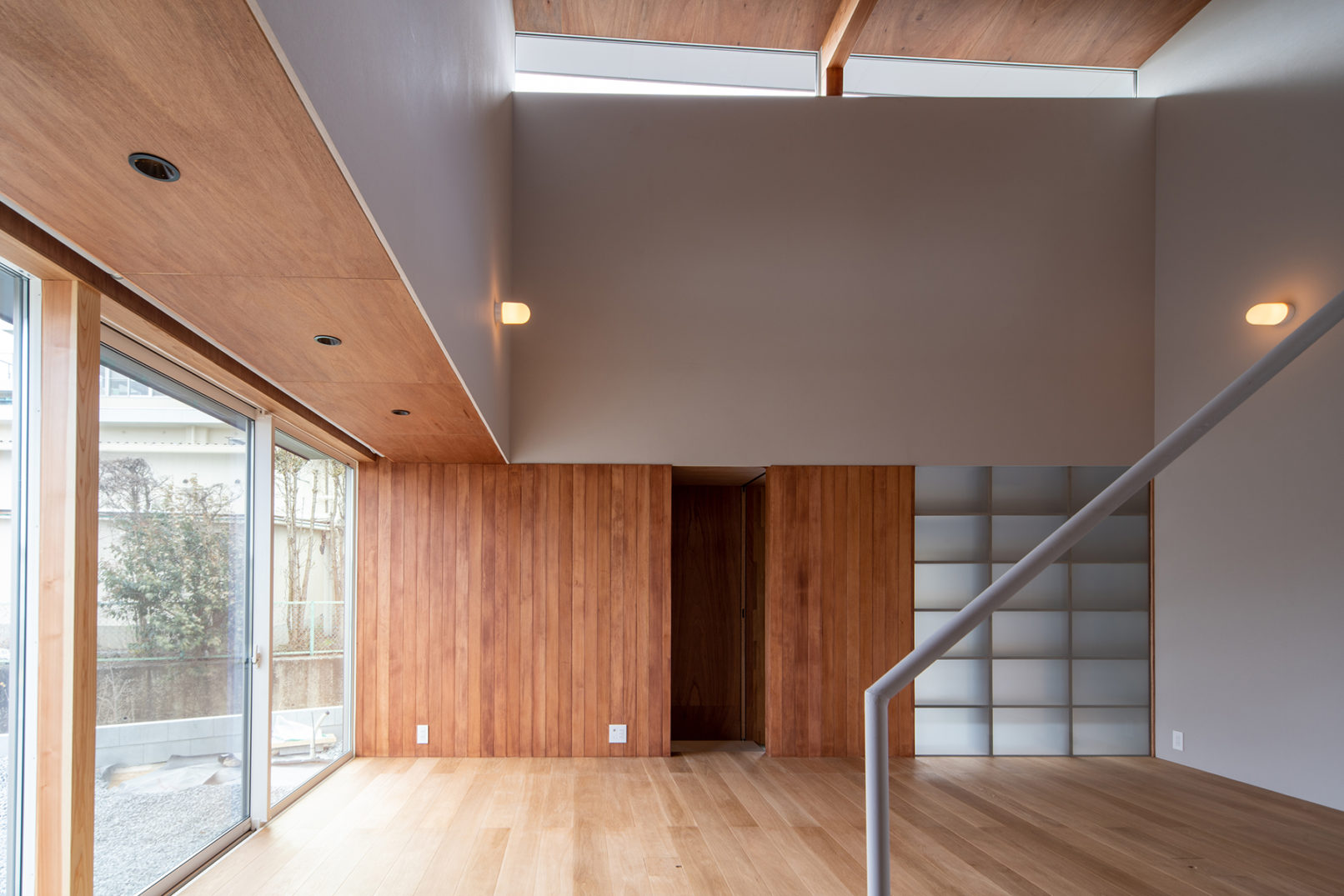 特に意識したことは、実際に住まう人が感じるであろうシーンをつくることであった。書斎で仕事をしていて外に目を向けると小さな庭に樹木が色づいているのが見えたり、寝室の窓辺から飼っている猫が車の動きを目で追っていたり、書斎の掃き出し窓から入った光がリビングまで漏れ出したり、ふと見上げた時に空を感じるような日常の風景の切り取りなど、そういった様々なシーンを散りばめることで、小さいながらも"暮らし"の中で情感のあふれる空間づくりを目指した。