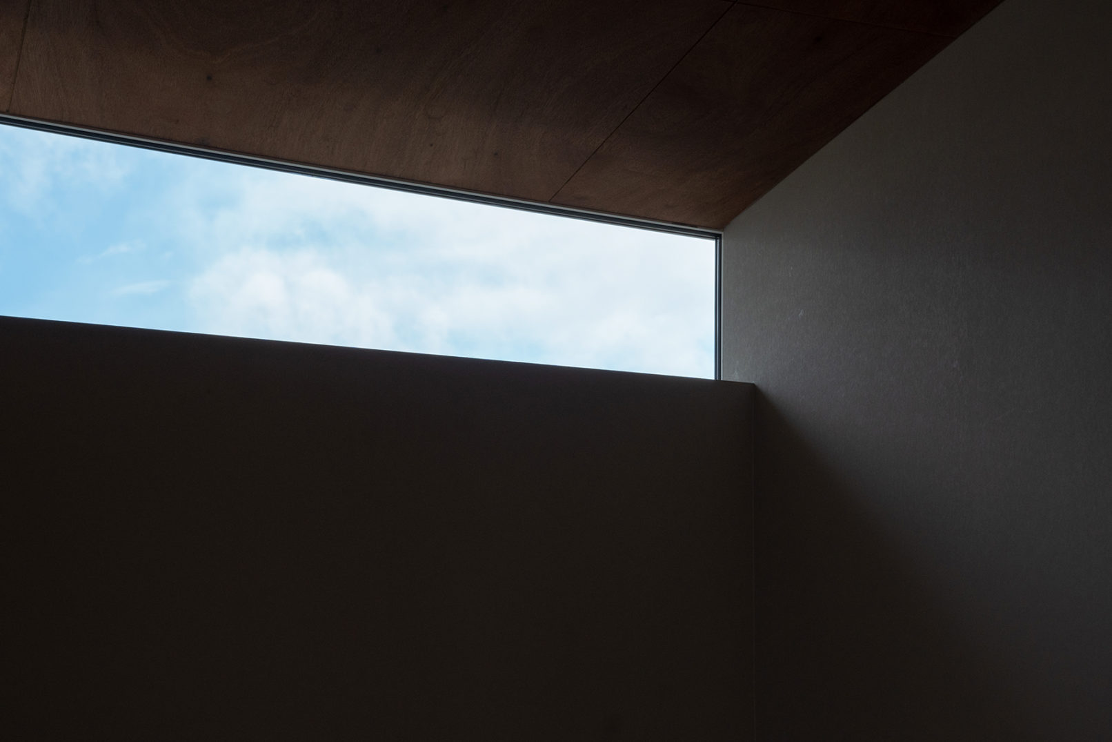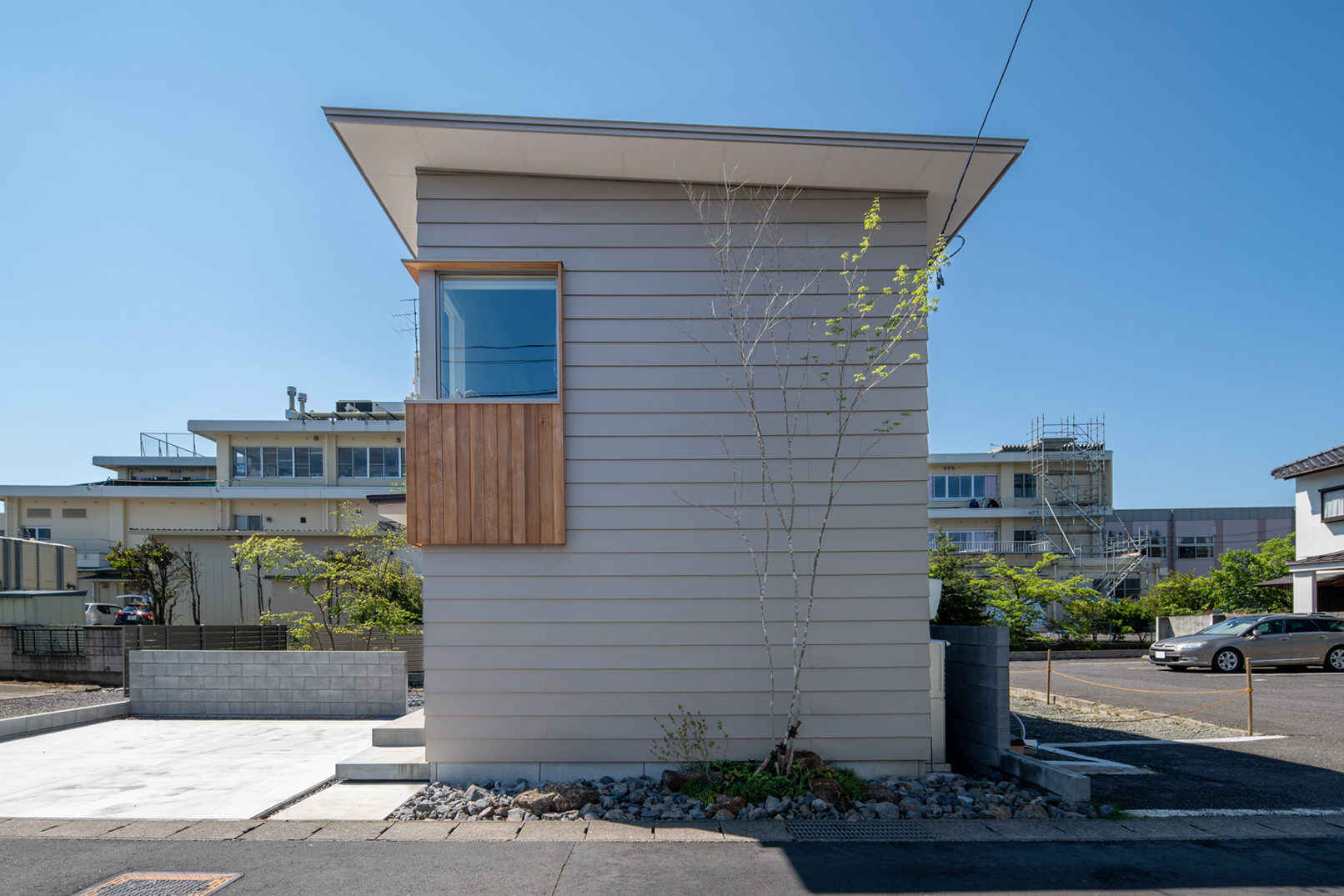 敷地は、北面が道路に面し、南面には河川を挟み大きな建物がある。距離が離れているものの、その存在は視覚的な面や採光面でも決していいものではないと感じた。そこで北の駐車場、南の庭というスタンダードな配置ではなく、建物を西側に寄せて配置した。こうすることで道路面から見たときに南北を視線が抜けるようになり、街に余白をつくることができた。室内空間に関しても環境の乏しい南面は閉じ、河川方向や道路などの抜けをめがけて開口部を計画している。