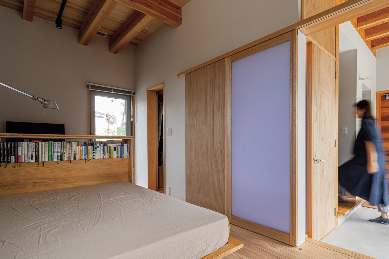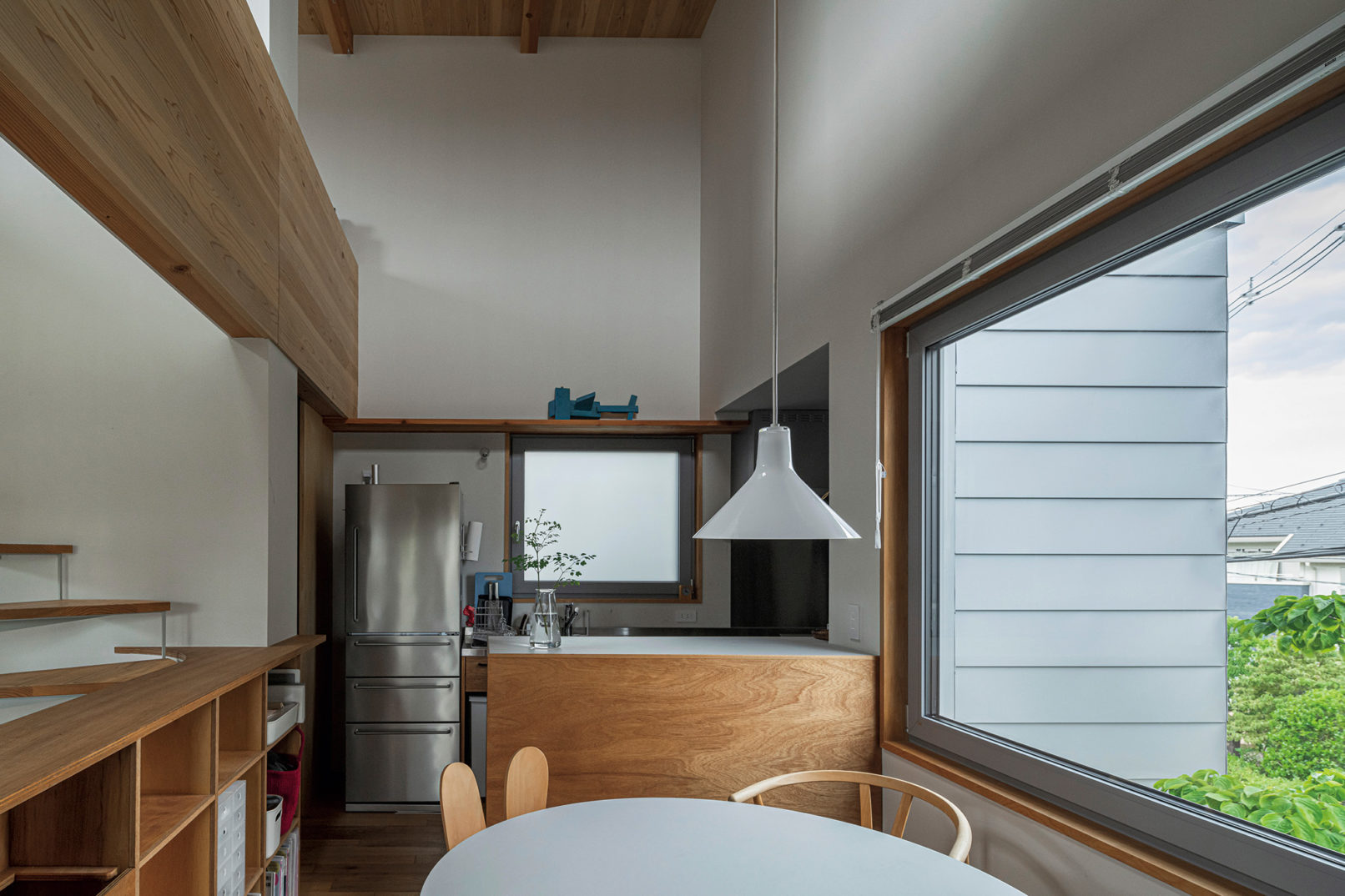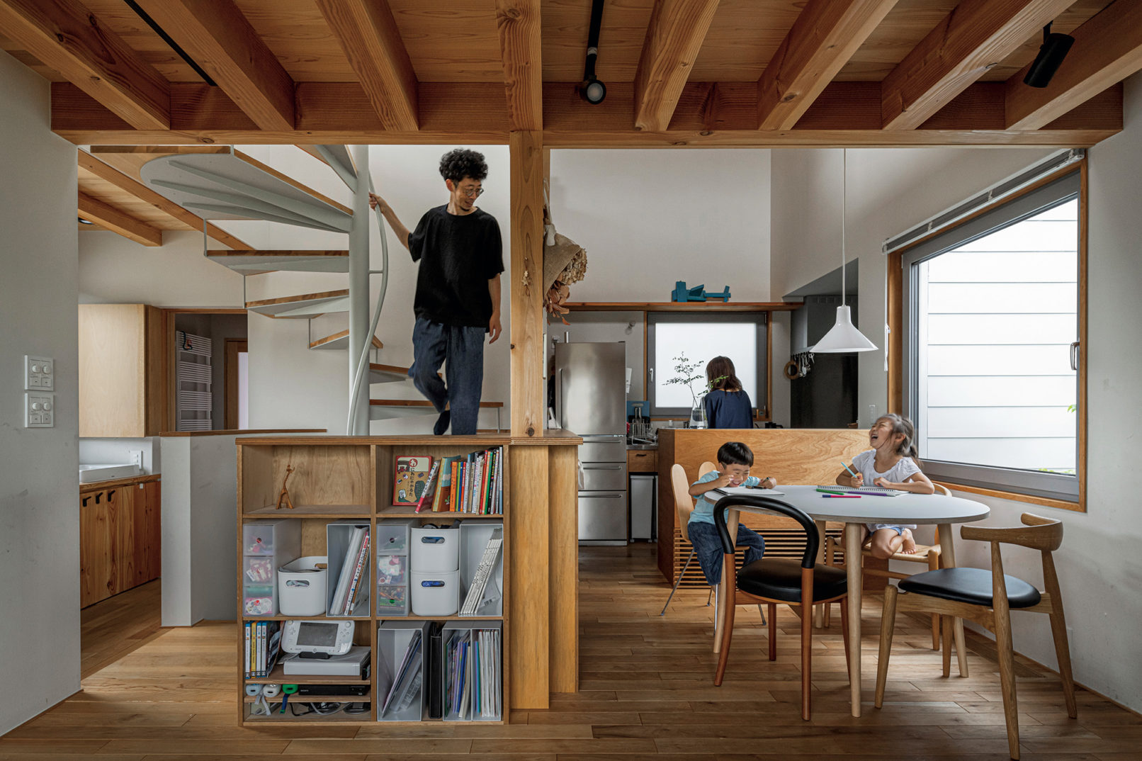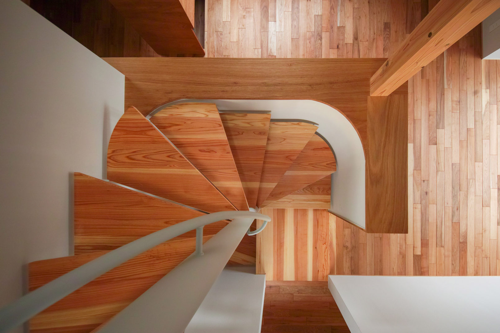 建物内部は、中心から少しずらした位置に1.82角の螺旋階段を配置することで空間が分節されています。階段周りの空間は小さいですが、日本家屋の続き間のように空間が重なり、視線の先に三角形の空地に生えるアオダモやコナラがあり、さらにその先にある周辺住宅の緑につながります。その複雑さが、とても小さい家だけれど、豊ともいえる広がり、展開になっています。